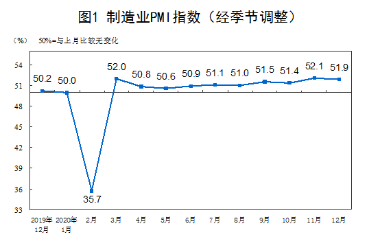 12月份,中国制造业采购经理指数(PMI)为51.9%,虽比上月回落0.2个百分点,但连续10个月位于临界点以上,表明制造业继续稳步恢复。