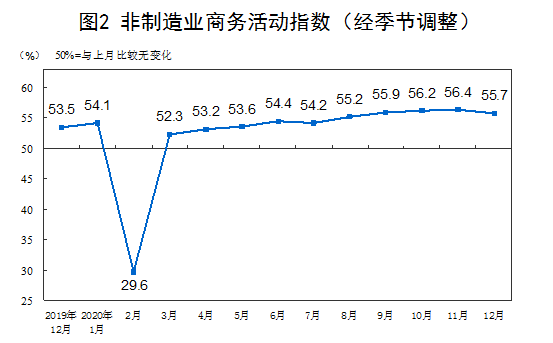 12月份,非制造业商务活动指数为55.7%,虽低于上月0.7个百分点,但继续位于较高景气区间,非制造业延续稳步复苏势头。