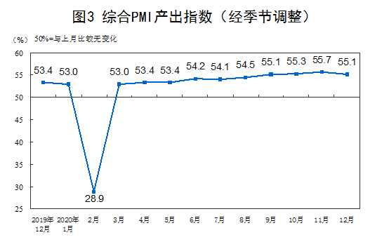 12月份,综合PMI产出指数为55.1%,虽比上月回落0.6个百分点,但连续4个月位于55.0%以上的较高景气区间,表明近期我国企业生产经营活动持续恢复向好。