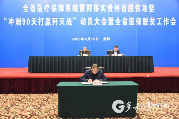 4月15日,全省医保系统贯彻落实贵州省脱贫攻坚“冲刺90天打赢歼灭战”动员大会暨全省医保脱贫工作会在贵阳召开,各市(州)医疗保障局局长,贵安新区管委会社会事务管理局、住房公积金和社会保障服务中心主要负责同志现场签订了《脱贫攻坚总攻责任状》。
