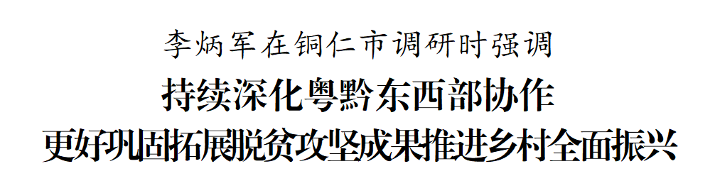 8月31日至9月1日,省委副书记、省长李炳军到铜仁市碧江区、江口县、德江县调研。他强调,要深入贯彻习近平总书记关于深化东西部协作的重要指示和在贵州考察时的重要讲话精神,持续深化粤黔东西部协作,更好巩固拓展脱贫攻坚成果、推进乡村全面振兴,全力推动兴业、强县、富民一体发展。副省长杨同光参加。