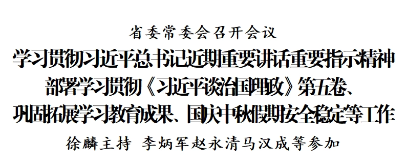 9月26日,省委常委会召开会议,学习贯彻习近平总书记近期重要讲话重要指示精神,学习贯彻《习近平谈治国理政》第五卷出版座谈会精神,部署巩固拓展深入贯彻中央八项规定精神学习教育成果、国庆中秋假期安全稳定等工作。