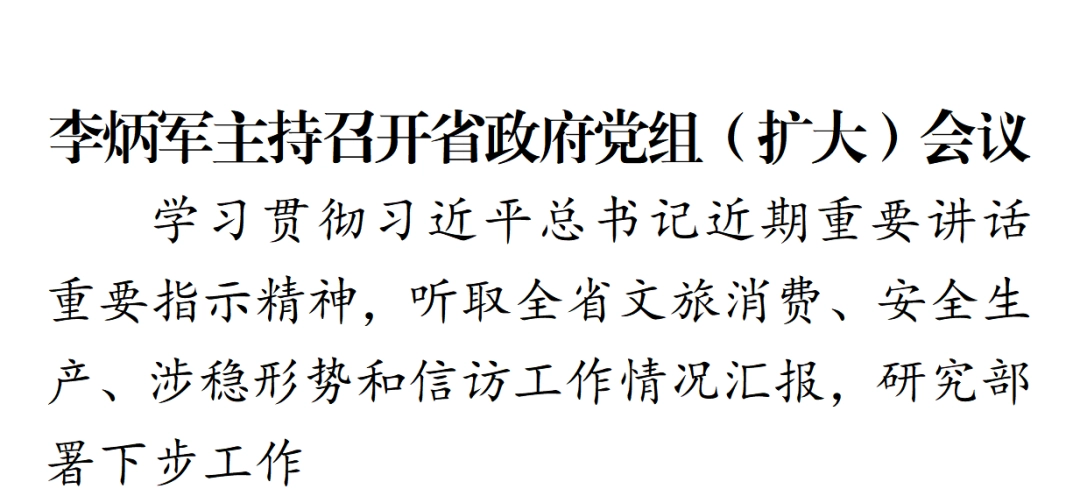 10月9日,省长、省政府党组书记李炳军主持召开省政府党组(扩大)会议,深入学习贯彻习近平总书记近期重要讲话重要指示精神,听取全省文旅消费、安全生产、涉稳形势和信访工作情况汇报,研究部署下步工作。省政府党组成员、副省长参加。
