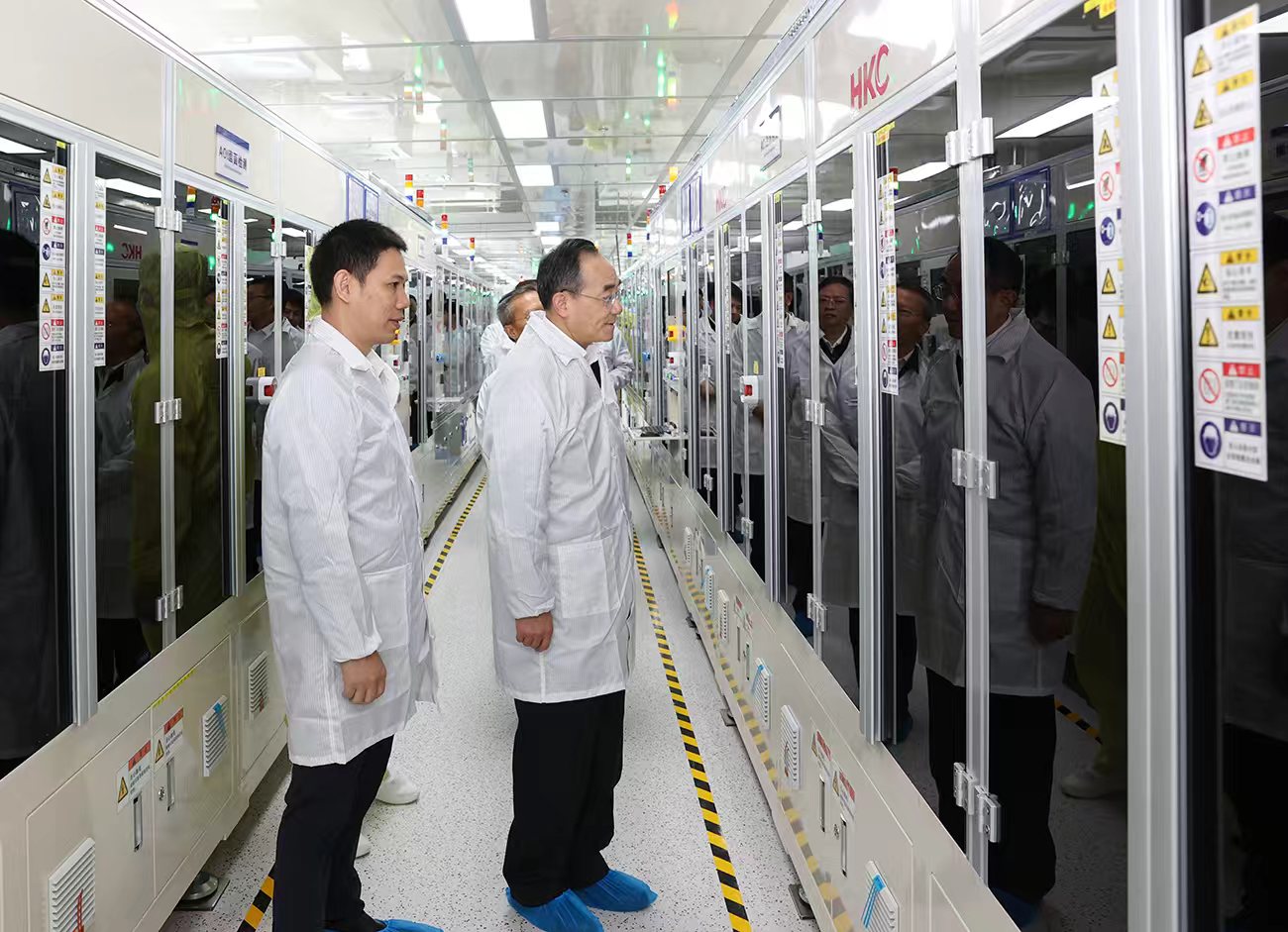 图为徐麟在贵州惠科光电显示产业集群项目考察,了解项目推进和企业生产经营情况。